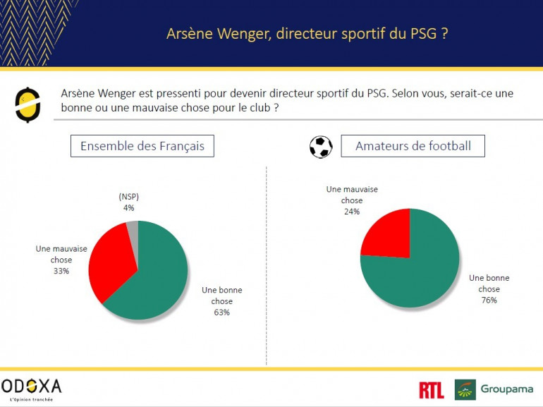 Parmi ces rumeurs, l’idée de voir Arsène Wenger au PSG, non pas en tant qu’entraîneur mais en tant que directeur sportif ou manager général est persistante. Pour 63% des Français, ce serait une bonne chose pour le club. Cette approbation est même partagée par 76% des amateurs de football.