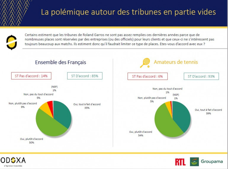 Certaines affiches sur les courts principaux n'ont pas fait le plein en tribunes. Faut-il limiter le nombre de places réservées aux entreprises (ou officiels), dont les clients ne viennent pas toujours voir les matches ? Oui, répondent très largement les Français et les Françaises (85%), de même que les amateurs et amatrices (93%).