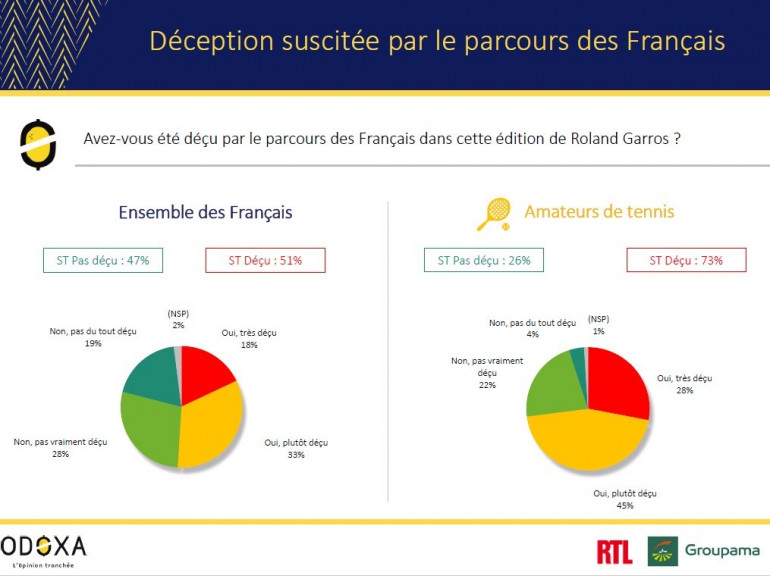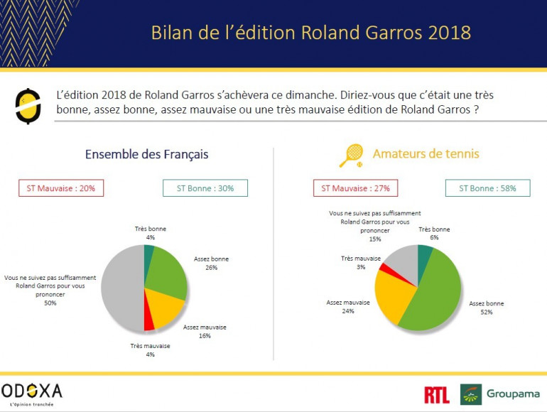 Ce tournoi de Roland-Garros 2018 restera comme un bon cru pour 30% des Français (une mauvaise édition pour 20%) et 58% des amateurs de tennis. Un Français sur deux se déclare cependant déçu ou très déçu par le parcours des joueurs français. Leurs explications : le manque de motivation et leur niveau.