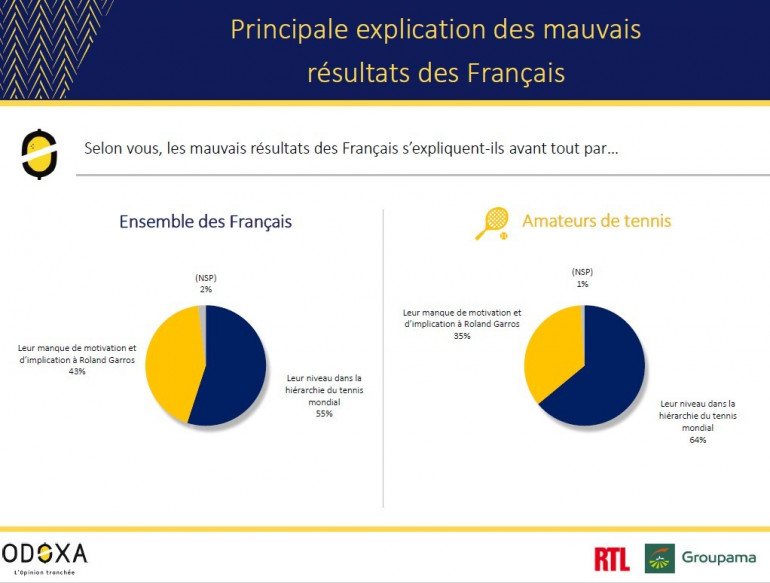 Comment expliquer ces mauvais résultats ? Les personnes interrogées citent leur niveau dans la hiérarchie mondiale à 55%, leur manque de motivation et d'implication à Roland-Garros à 43%.