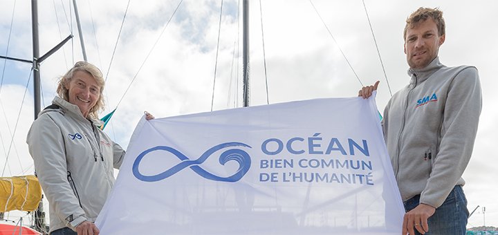 Depuis plusieurs jours, Catherine Chabaud est sur les pontons de Saint Malo. Elle passe de voilier en voilier, rencontre les skippers et distribue des drapeaux pour relayer son appel pour que l'Océan soit reconnu bien commun de l'Humanité.