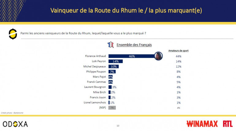 Parmi les anciens vainqueurs, c’est Florence Arthaud qui a le plus marqué de Français (46%) de loin devant Loïk Peyron (14%) et Michel Desjoyeaux (10%). Enfin, concernant cette 12e édition, les favoris sont Armel Le Cléac’h (32%) devant François Gabart (25%) dans la catégorie Ultim (32%), Kevin Escoffier (47%) devant Jérémie Beyou (23%) en Imoca.