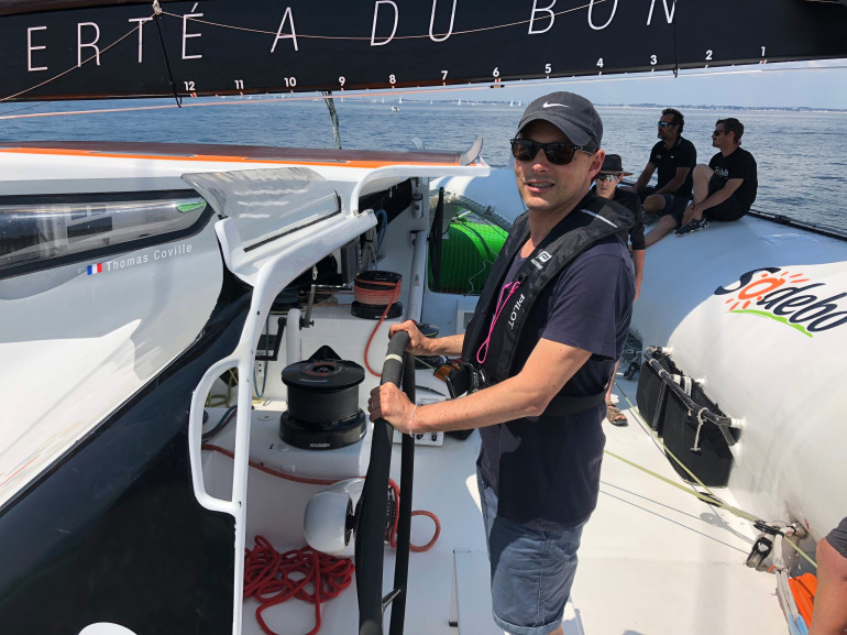 MArc-Olivier Fogiel à bord du Trimaran de Thomas Coville