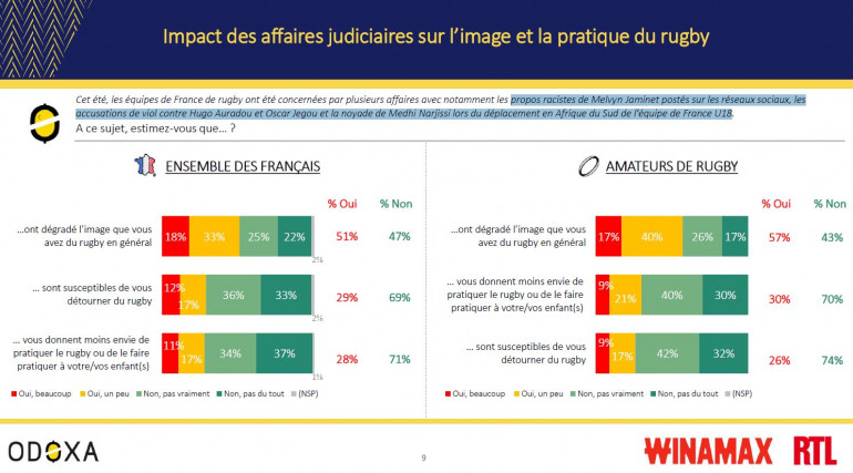 Les récentes affaires ont fait l’effet d’une onde de choc pour le rugby français : 51% des Français déclarent qu’elles ont dégradé leur image de ce sport, 29% qu’elles peuvent les en détourner et même 28% qu’elles leur donnent moins envie de pratiquer le rugby ou de le faire pratiquer à leur enfant. Dans ce contexte, la mise en place d’un cadre plus strict pour les équipes de France est largement validée : 7 à 9 Français sur 10 valident les différentes mesures qui pourraient être décidées.