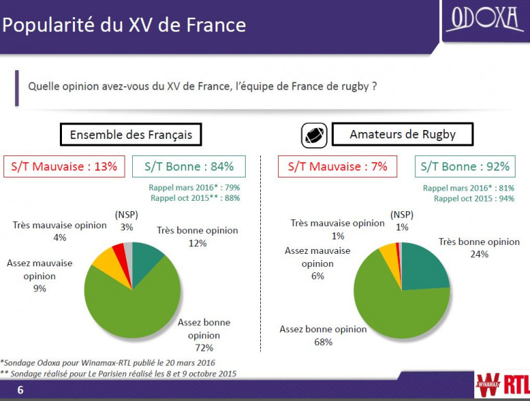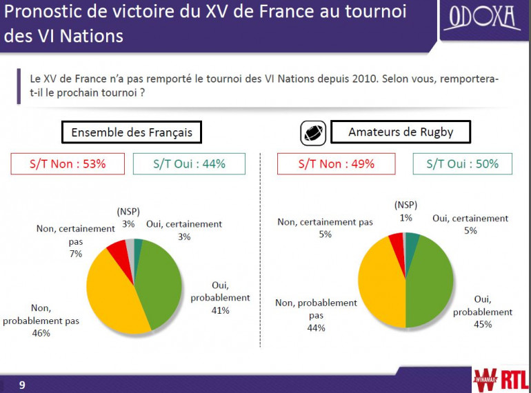 Malgré une opinion positive tant sur les joueurs que sur l'entraîneur, 53 % des Français ne voient pas les Bleus remporter le tournoi des VI nations cette année. Depuis 2010, la France est maudite. Six ans de disette donc, du jamais vu pour le XV de France depuis les années 1970. Et même parmi ceux qui y croient (44 %), ils ne sont que 3 % à être certains d'une victoire. Même ordre de grandeur chez les amateurs de rugby : 49 % pensent que les Bleus ne l'emporteront pas, et 5 % seulement sont certains du contraire.