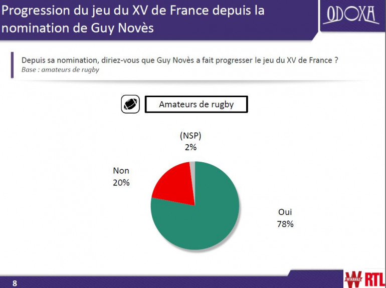 Et s'il est une personnalité qui semble tirer son épingle du jeu, c'est bien Guy Novès. Environ 78 % des amateurs de rugby estiment qu'il a fait progresser le jeu du XV de France depuis son arrivée à la tête de l'équipe. Déjà à l'époque, il était considéré comme un bon sélectionneur par 93 % de ces mêmes amateurs. Et malgré une cinquième place au tournoi des VI nations, l'ancien toulousain garde la confiance du peuple.