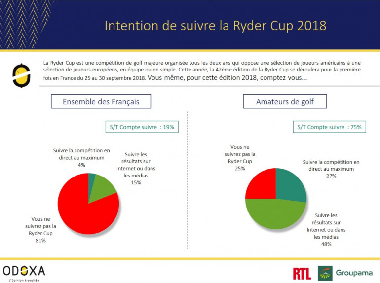 Cette enquête a été réalisée alors que la Ryder Cup se déroulera du 28 au 30 septembre prochain au Golf national de Saint-Quentin-en-Yvelines. Un événement que connaissent près d'un Français sur deux (48%). Toutefois, ils ne seront que 19% à suivre la compétition.
