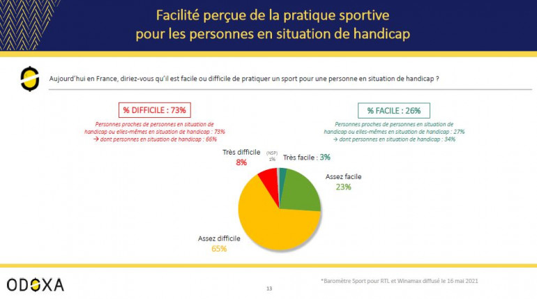 Seuls 26% des Français jugent qu’il est facile de pratiquer un sport pour une personne en situation de handicap alors que près des trois-quarts d’entre eux estiment cela difficile (73%). Le jugement est également critique auprès des personnes elles-mêmes en situation de handicap : 66% estiment que pratiquer un sport est difficile, tout comme 74% des