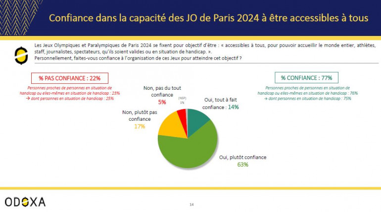 Et cet objectif apparait tout à fait réalisable pour les Français : 77% d’entre eux font confiance à l’organisation des JO de Paris 2024 pour l’atteindre, tout comme 76% des personnes en situation de handicap ou proches de personnes en situation de handicap.