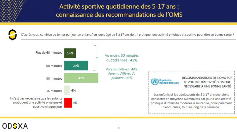 sportive quotidienne. En effet, seuls 43% des Français, 40% des parents d’élèves et 43% des parents d’enfants scolarisés dans le primaire savent qu’un enfant ou un jeune