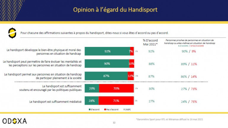 Le handisport est par ailleurs reconnu dans sa capacité à développer le bien-être physique et moral des personnes en situation de handicap (92%), à permettre de faire évoluer les mentalités (90%) et à ce que les personnes en situation de handicap participent pleinement à la société (87%). Mais une large majorité de Français déplorent qu’il ne soit pas assez soutenu et encouragé par les politiques publiques (70%) et pas suffisamment médiatisé (71%).