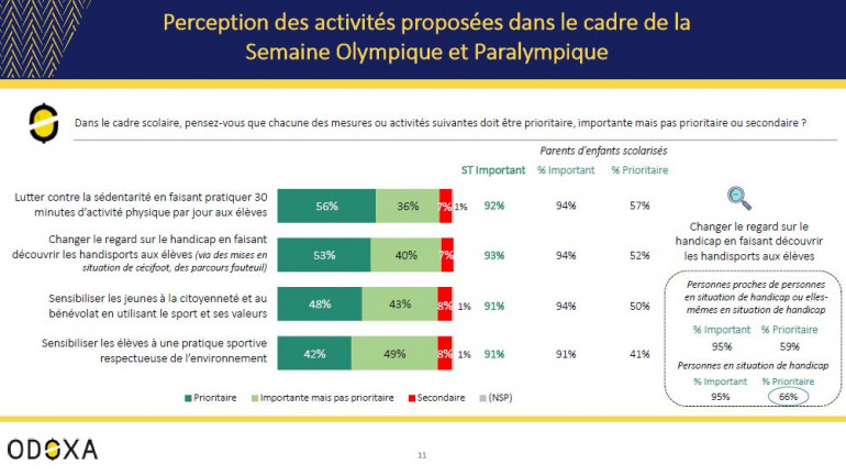 L’ensemble des dispositifs mis en place cette année dans le cadre de la semaine olympique et paralympique sont validés par les Français et les parents d’élèves. Ainsi, ils sont plus de 9 sur 10 à juger qu’il est important de lutter contre la sédentarité en faisant pratiquer 30 minutes d’activité physique par jour aux élèves (Français 92%, parents d’élèves 94%). Cet objectif est le plus soutenu dans l’opinion et plus de la moitié des Français (56%) et des parents d’élèves (57%) jugent même que cela doit être prioritaire.