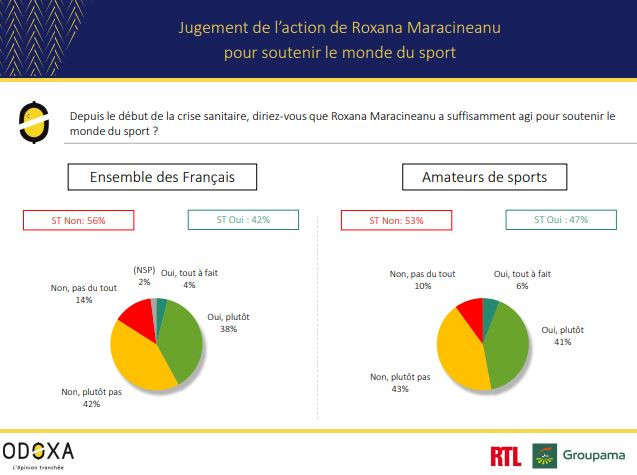 Mais la ministre ne s’est pas montrée suffisamment active depuis le début de la crise sanitaire aux yeux de nos concitoyens. Pour 56% d’entre eux, comme pour 53% des amateurs de sport, Roxana Maracineanu n’a pas suffisamment agi pour soutenir le monde du sport.