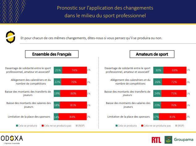 Cela dit, ils sont très peu à croire que l'un de ces points puissent évoluer lorsque les compétitions reprendront. Voici les principaux enseignements de la dernière enquête réalisée par Odoxa pour RTL et Groupama.
