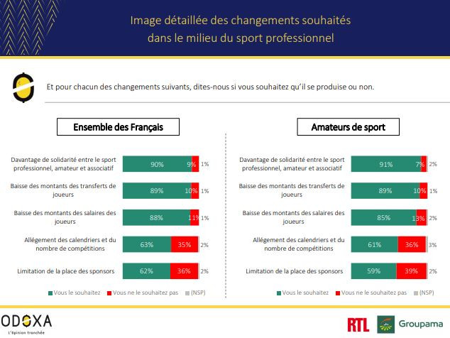 Les sondés réclament notamment plus de solidarité avec les amateurs et le monde associatif (90%), une baisse du montant des transferts des joueurs (89%) et de leurs salaires (88%) ou encore la limitation de la place des sponsors (62%).