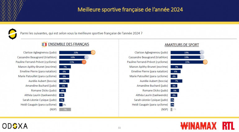 Chez les sportives, le match est bien plus serré : sacré par équipe, la judoka Clarisse Agbegnenou arrive en tête pour le grand public (20%) devant la triathlète Cassandre Beaugrand (16%) et la championne olympique de VTT cross-country Pauline Ferrand-Prévot (15%). Mais cette dernière l'emporte chez les amateurs de sport (20%, 19% pour Agbegnenou et Beaugrand).