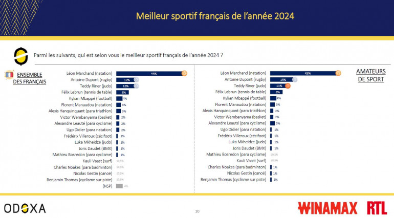 Du côté des sportifs plébiscités, c'est là encore sans surprise que Léon Marchand arrive en tête avec 44% des citations chez les Français, 45% chez les amateurs de sport. Le nageur quadruple médaillé d'or cet été devance Antoine Dupont (12%), sacré champion olympique de rugnby à VII, et Teddy Riner (12%).