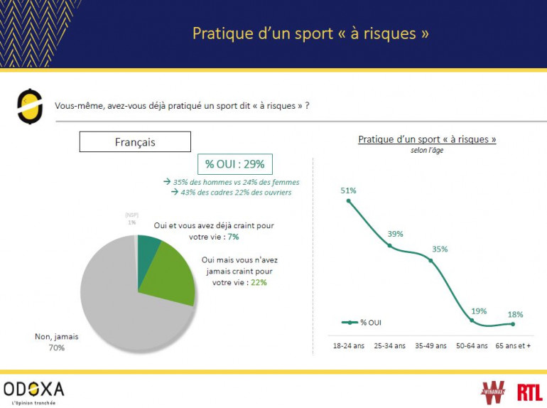 51% des 18-24 ans, 39% des 25-34 ans, 35% des 35-49 ans pour seulement 19% des plus de 50 ans affirment en effet avoir déjà pratiqué un sport à risques. Notons que 7% des sondés ont même déjà craint pour leur vie.