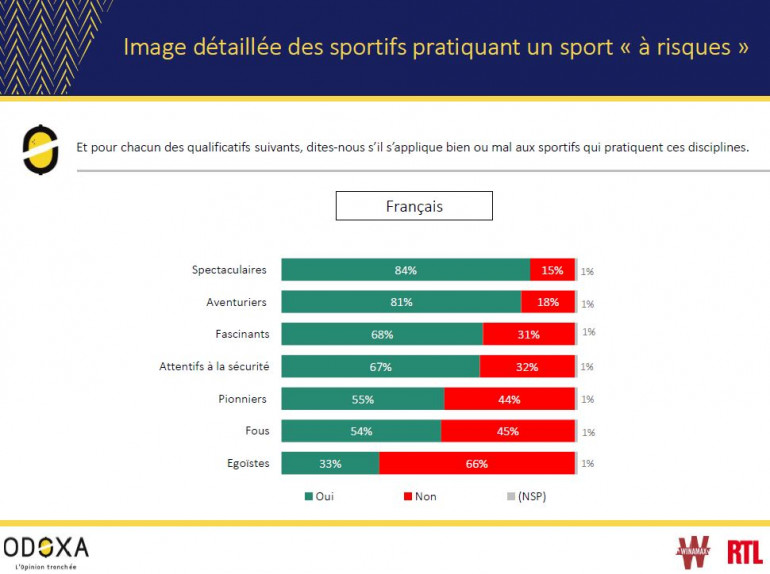 Plus de deux tiers des Françaises et des Français admirent les sportives et les sportifs qui pratiquent une discipline à risques, quand 31% d'entre eux les trouvent inconscient(e)s. Spectaculaires, aventuriers et fascinants sont les mots qui reviennent le plus pour les qualifier.