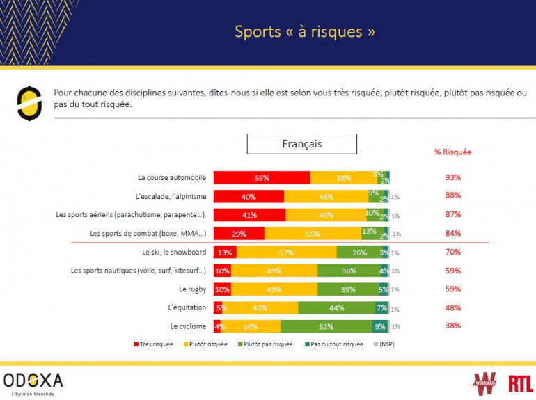 La course automobile arrive en tête de ces sports à risques selon les sondés, devant l'escalade et l'alpinisme, puis les sports aériens. Enfin, 29% des personnes interrogées ont déjà pratiqué une discipline dangereuse. Voici les principaux enseignements du dernier sondage réalisé par Odoxa pour RTL et Winamax.