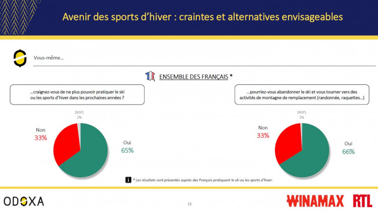 Enfin, les pratiquants sont également inquiets : 65% craignent de ne plus pouvoir skier dans les prochaines années et 66% pourraient abandonner la discipline et se tourner vers des activités de montagne de remplacement. Voici les principaux enseignements du dernier sondage réalisé par Odoxa pour Winamax et RTL. L'enquête a été réalisée selon la méthode des quotas sur internet le mercredi 31 janvier 2024 auprès d'un échantillon de 1.001 personnes représentatives de la population française âgée de 18 ans et plus, parmi lesquelles 358 amateurs de ski.
