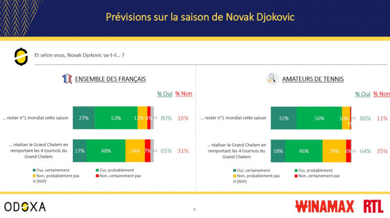 65% des sondés le pensent même capable de réaliser le Grand Chelem, c'est à dire remporter les quatre tournois du Grand Chelem de l'année (Open d'Australie, Roland-Garros, Wimbledon et l'US Open), ce qui n'a été fait qu'une seule fois dans l'histoire, en 1969 par l'Australien Rod Laver ; Djokovic avait failli le faire en 2021 mais avait été battu en finale de l'US Open par le Russe Daniil Medvedev.
