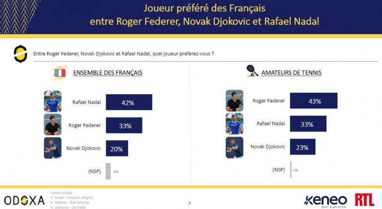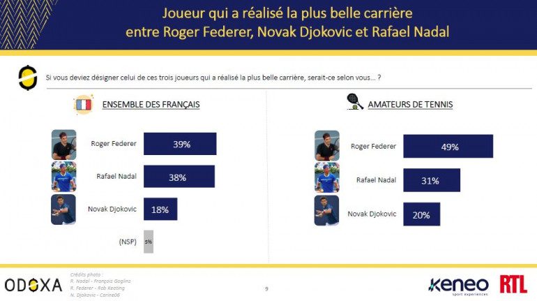 Interrogés sur le joueur de tennis qu'il préfèrent parmi Rafael Nadal, Roger Federer et Novak Djokovic, les Français citent d'abord l'Espagnol puis le Suisse et enfin le Serbe. Mais chez les amateurs de tennis, c'est Federer qui sort en tête, devant Nadal et "Djoko". Tous se rejoignent en revanche pour désigner Federer comme celui qui a réalisé la plus belle carrière.