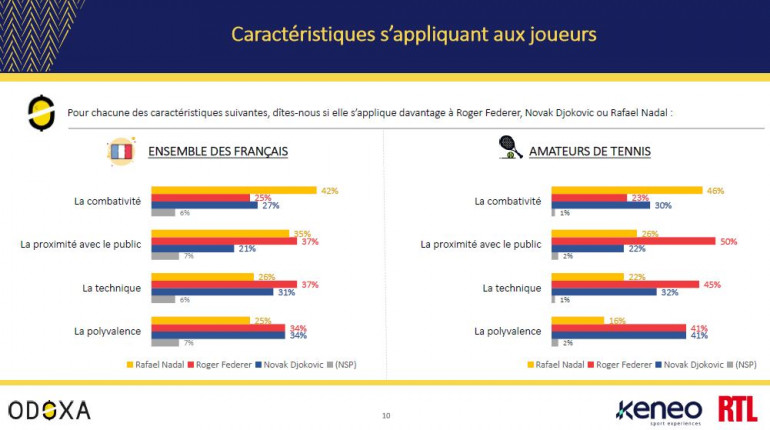 Rafael Nadal est reconnu pour sa ténacité ; 42% des Français et 46% des amateurs de tennis estiment en effet que c’est le plus combatif des trois. Chez Federer, c’est le tennis pur que l’on admire ; pour 37% des Français et 45% des amateurs de tennis, c’est le joueur le plus technique des trois.