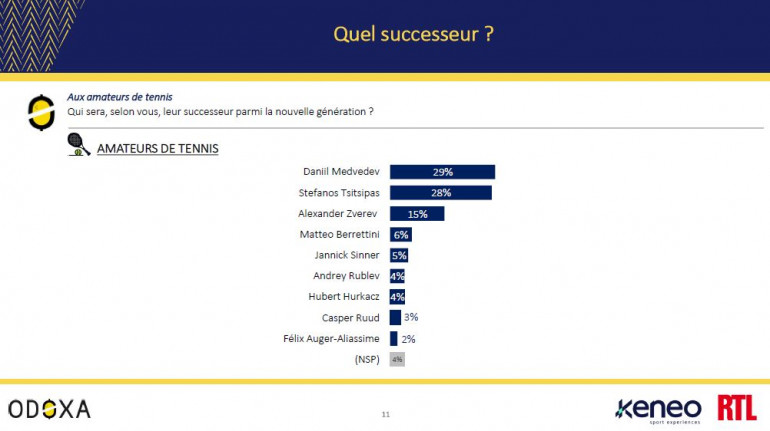 Pour les amateurs de tennis, ce sont Daniil Medvedev (29%) et Stefanos Tsitsipas (28%) qui sont les dignes successeurs du "Big Three". L'Allemand Alexander Zvrerev est désigné par 15% d’entre eux.
