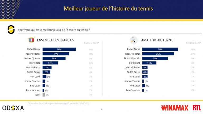 Et lorsqu'on demande aux Français qui est le meilleur joueur de tous les temps, c'est le Majorquin qui arrive en tête avec 26% des citations devant son grand rival suisse Roger Federer (21%) et le Serbe Novak Djokovic (18%), pourtant le plus titré en Grand Chelem (24 Majeurs - 20 pour Federer) ; âgé de 37 ans, ce dernier est le seul des trois "gants" encore en activité.