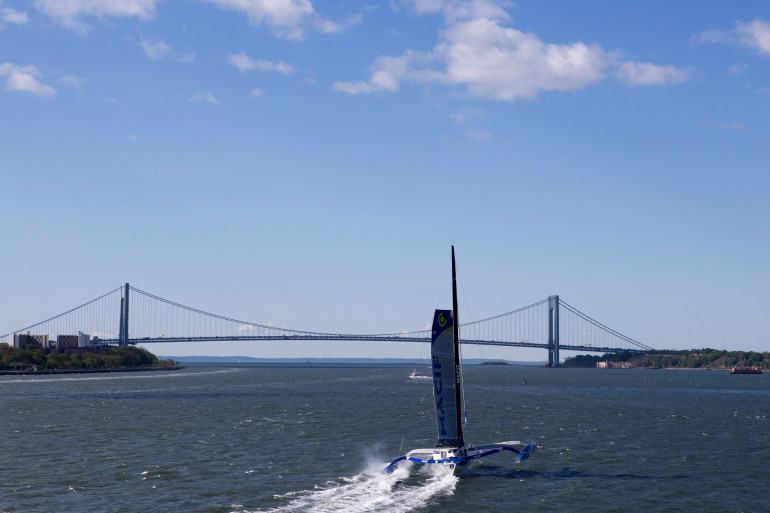"L’image de départ de nos quatre grands Ultime, aux côtés du Queen Mary 2, sera inoubliable", lance Thomas Coville qui, six mois après avoir pulvérisé le record du tour du monde en solitaire, se lance dans cette course inédite en équipage baptisée "The Bridge". Un parcours maritime de 3.150 milles entre le pont de Saint-Nazaire et le pont Verrazano de New-York.
