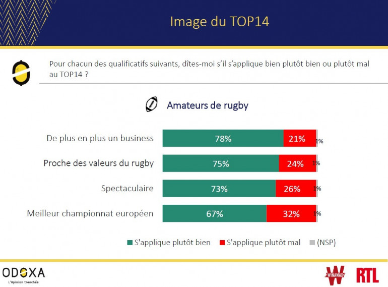 Quel que soit le sport, dès lors qu’il est professionnel, les championnats performants sont souvent accusés de faire passer l’argent avant le sport. Mais le Top 14 semble réussir la prouesse de combiner professionnalisation et conservation des racines. 78% des amateurs de rugby estiment en effet que le Top 14 est de plus en plus un business mais pour 75% d’entre eux, il reste proche des valeurs du rugby.