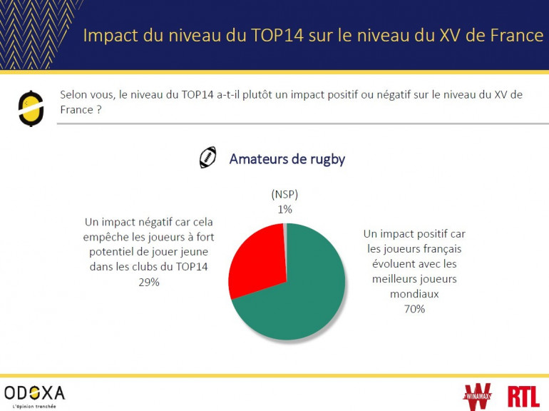 Mais les amateurs de rugby ne sont pas du tout d’accord avec cette idée, seuls 29% jugent qu’il est négatif. Pour 70% d’entre eux, l’impact est positif. Ils estiment en effet que les joueurs français évoluent avec les meilleurs joueurs mondiaux et en profitent pour progresser plus qu’attendu.