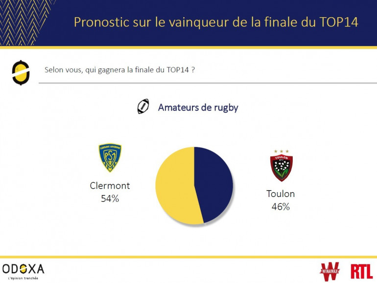 Les deux clubs ont terminé la saison régulière à la 2ème et à la 4ème place. Selon les amateurs de rugby, le match sera serré mais ils placent Clermont légèrement favori. 54% d’entre eux voient les jaunes et bleus s’imposer dimanche, 46% pronostiquant plutôt la victoire de Toulon.