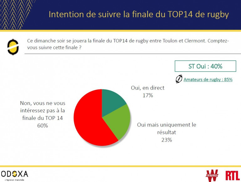 Deux Français sur cinq ont d'ailleurs l'intention de s'y intéresser. Voici le premier enseignement du sondage Odoxa pour RTL et Winamax réalisé réalisé par internet les mercredi 31 mai et jeudi 1er juin auprès d'un échantillon de 989 personnes représentatif de la population française âgée de 18 ans et plus, parmi lesquelles 392 amateurs de rugby.