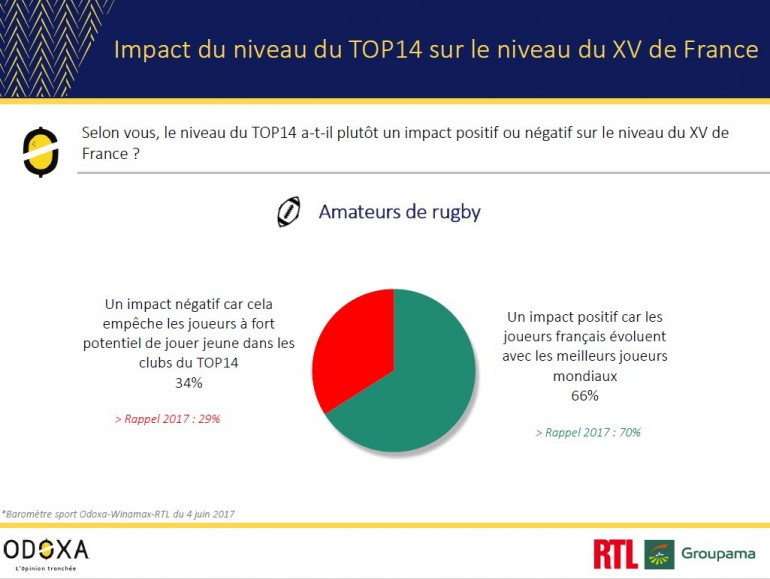 Pour les amateurs de rugby, c’est un effet inverse. Les deux tiers d’entre eux (66%) estiment en effet que ce niveau élevé a un impact positif puisqu’il permet aux joueurs tricolores d’évoluer avec les meilleurs joueurs de la planète.