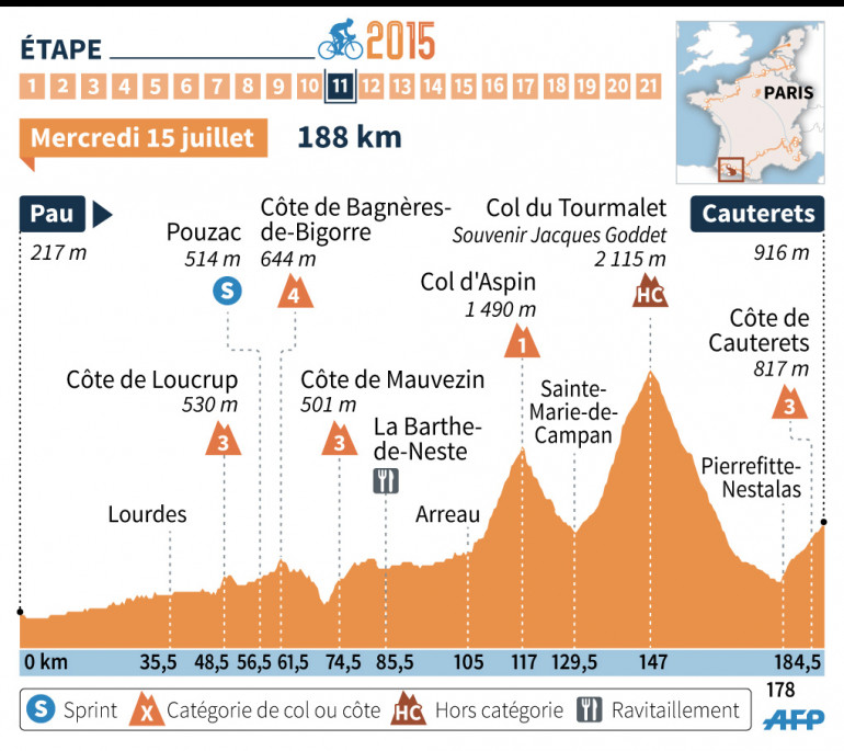 Mercredi 15 juillet, le peloton escaladera le Tourmalet dans la 11e étape, qui relie Pau à Cauterets sur 188 kilomètres. Quatre montées, dont la principale est le col d'Aspin (1re catégorie, km 117), précèdent le Tourmalet, la seule ascension classée hors catégorie du jour, abordée par son versant est à partir du village de Sainte-Marie-de-Campan.