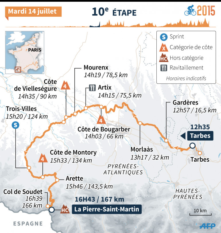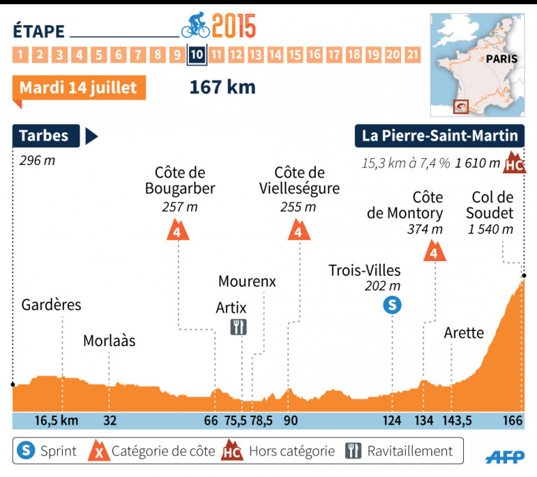 Le premier sommet du Tour de France 2015 attend les coureurs mardi 14 juillet lors de la 10e étape menant, sur 167 kilomètres, de Tarbes à La Pierre-Saint-Martin dans les Pyrénées. "Le peloton change de braquet après les gros braquets utilisés pendant près de dix jours sur le plat et sur dans les contre-la-montre et dans les bordures", souligne Laurent Jalabert.