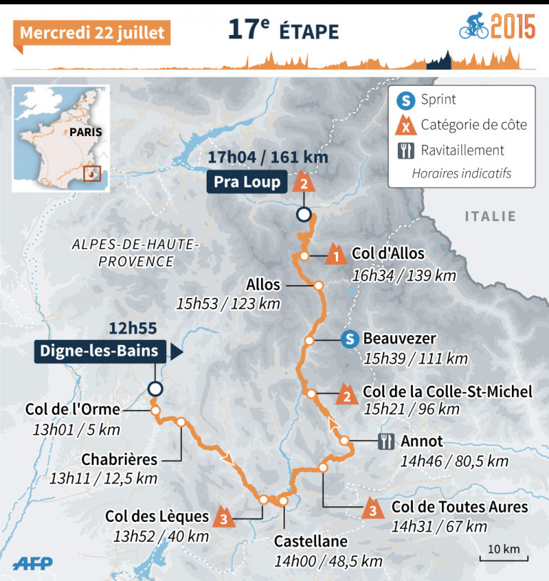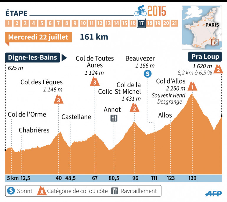La 17e étape du Tour de France s'annonce très intense, ce mercredi 22 juillet dans les Alpes, entre Digne-les-Bains et Pra Lou (161 km). Au programme de cette journée, la descente redoutable du col d’Allos (1e catégorie), point culminant de cette édition 2015. Départ à 12h45.