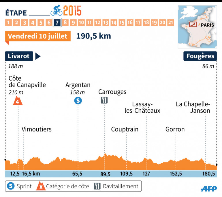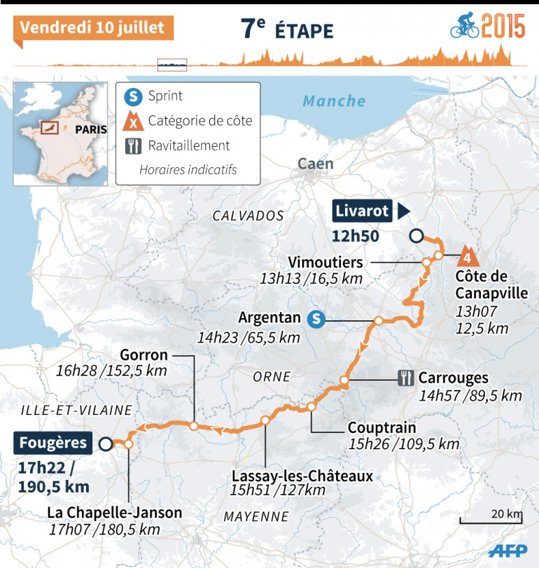 Le Tour visite la Basse-Normandie du Nord-Est vers le Sud-Ouest au long de la 7e étape qui relie vendredi Livarot à Fougères sur 190,5 kilomètres. Après le départ donné de la petite cité de Livarot, dont le fromage fait l'objet d'un label AOC, la course emprunte les routes de la semi-classique Paris-Camembert et la côte de Canapville, seule difficulté du jour répertoriée en quatrième catégorie (Km 12,5).