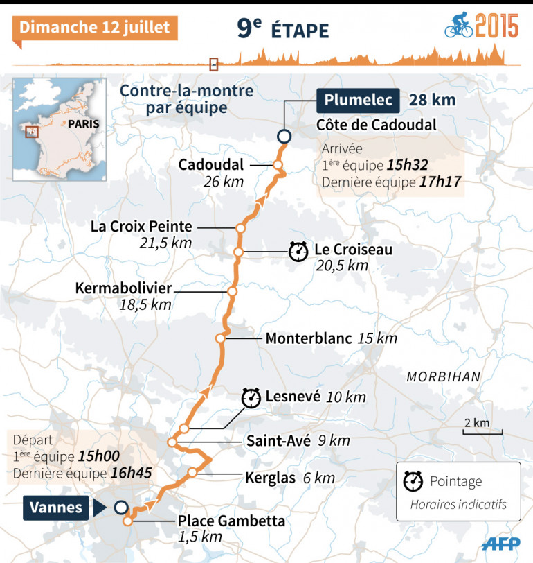 Le contre-la-montre par équipes du Tour de France a délivré dimanche à Plumelec un verdict très serré en faveur de la formation BMC devant la Sky du Britannique Chris Froome, toujours en jaune avant la montagne. Entre les équipes de Tejay van Garderen, l'Américain désormais deuxième du classement général, et de Chris Froome, l'écart a atteint 1 seconde au bout des 28 kilomètres séparant Vannes de Plumelec.