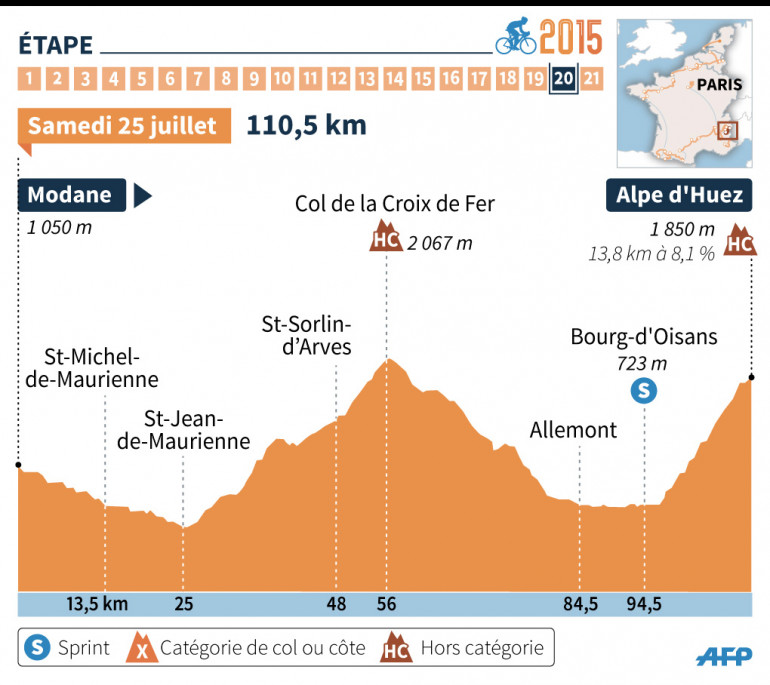 C'est l'heure de vérité pour le Tour de France avec la 20e et avant-dernière étape, samedi 25 juillet à la veille de la parade dans Paris. À partir de Modane (départ réel à 13h15), le peloton doit parcourir 110,5 kilomètres pour rallier la mythique arrivée au sommet de l'Alpe d'Huez (13.8 km de montée à 8.1% de pente moyenne). "Tous les grimpeurs rêvent de gagner. C'est un petit peu comme les sprinteurs sur les Champs-Élysées", estime Laurent Jalabert sur RTL.