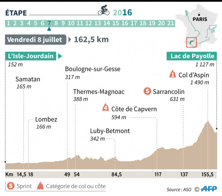 Les choses sérieuses commencent véritablement pour les favoris du Tour de France 2016 vendredi 8 juillet avec un premier col mythique à franchir dans les Pyrénées, l'Aspin. 12 km de montée à 6,5% de pente moyenne sont au programme dans le final de cette 7e étape. Le sommet est situé à 7 km de l'arrivée, située au Lac de Payolle, après une courte descente.