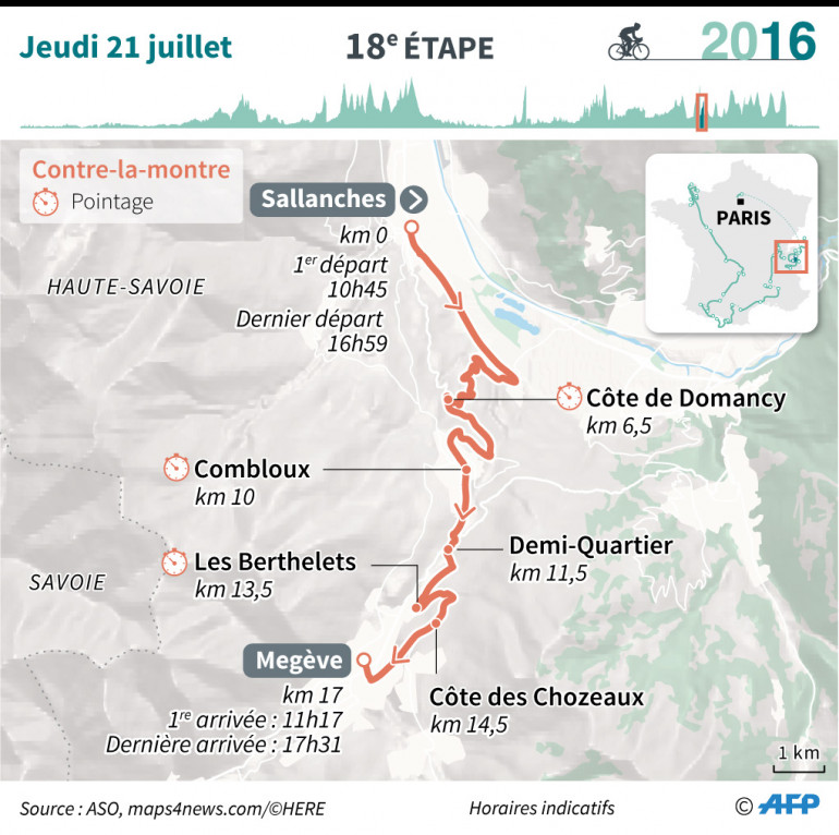 Une rapide descente de 2 kilomètres conduit à l'arrivée jugée dans la station de Megève, ville-étape inédite pour le Tour de France. Trois points de chronométrage officiels sont prévus au sommet de Domancy (Km 6,5), à Combloux (Km 10) et aux Berthelets, dans la côte des Chozeaux (Km 13,5). Premier départ à 10h45. Froome s'élancera à 16h59.