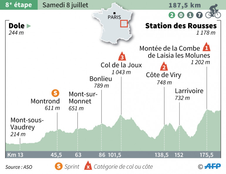 C'était sans doute la première étape difficile sur un Tour de France 2017 qui cache encore ses défis les plus ardus, lancés à des forçats de la route exposés à la canicule et à une étape "casse-pattes" entre Dole et Station des Rousse dans les Vosges. Le genre de profil d'étape que les sprinteurs redoutent mais les favoris aussi car il n'offre aucun temps-mort tant les valons s'enchaînent, avec un risque de perdre des minutes. Dès le début, les profils des attaquants dessinaient la courses à attendre. Barguil, Calmejane, Pauwels, Bakelants ou encore Trentin.