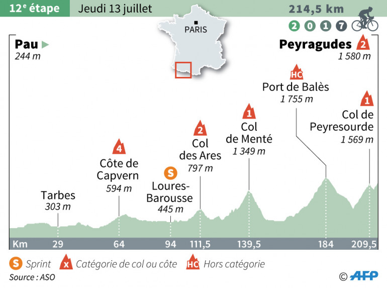 Avant l'enchaînement de trois cols de 1re catégorie sur seulement 101 km entre Saint-Girons et Foix pour le feu d'artifice du vendredi 14 juillet, le parcours de 214,5 km entre Pau et Peyragudes promet de faire des dégâts, jeudi 13 juillet. Après une côte de 4e catégorie au km 64 (7,7 km de montée à 3,1% de pente moyenne), la seconde moitié de cette 12e étape s'annonce palpitante.