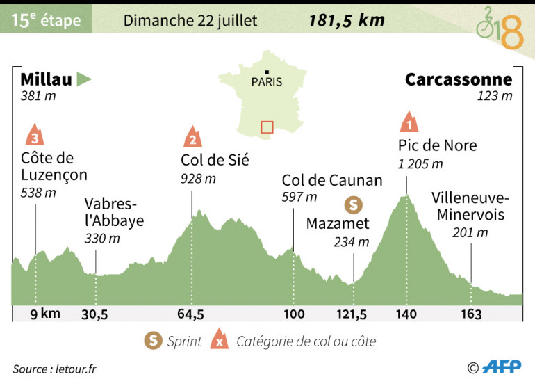 Le Tour poursuit sa traversée du Sud de la France d'Est en Ouest pour rejoindre les Pyrénées, dimanche 22 juillet, avec une nouvelle étape accidentée entre Millau et Carcassonne au lendemain d'une excitante journée entre Saint-Paul-Trois-Châteaux et Mende.