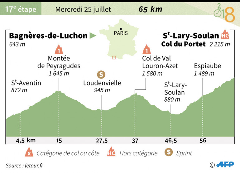 65 kilomètres dont 38,3 d'ascension : la 17e étape du Tour de France propose un concentré inédit entre Bagnères-de-Luchon et Saint-Lary-Soulan, mercredi 25 juillet. "Un truc de fou", sourit le directeur de course Thierry Gouvenou, qui souligne la nouveauté du départ façon F1. Les coureurs seront en effet positionnés selon leur place au classement général.