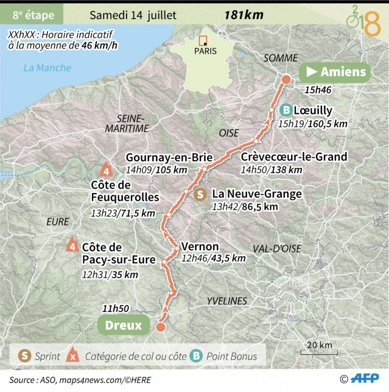 De Chartres, la caravane du Tour de France a effectué une liaison de 39 km pour rejoindre Dreux, où est donné le départ de cette 8e étape. Direction Amiens, samedi 14 juillet, pour se projeter le lendemain vers les pavés de Roubaix. Deux difficultés sont répertoriées sur la première moitié de la course : la côte de Pacy-sur-Eure au km 35 (2 km de montée à 4,3% de pente moyenne) et la côte de Feuquerolles au km 71,5 (2,3 km à 4,3%).