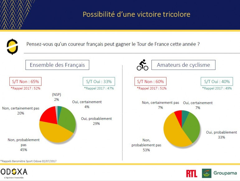 Bardet a encore terminé 3e l'an passé, comme Thibaut Pinot en 2014. Ces résultats incitent moins les sondés à l'optimisme que l'an passé, mais ils sont tout de même 33% à imaginer un sacre de l'un des leurs le dimanche 29 juillet prochain sur les Champs-Élysées. Chez les amateurs, le pourcentage grimpe à 40.